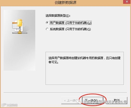 step4:出现“创建数据库源”弹窗,选择“用户数据源”后点击下一步