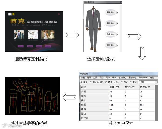 博克(定制)服装CAD系统软件设备,专业软件设备生产缝制。 团体订制输入每人尺寸自动生成定制样板,提高效率、效果。