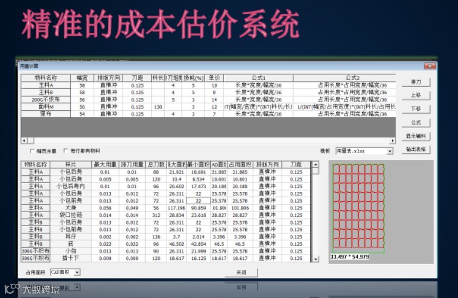 是目前将成本估价排刀算法做得优质的系统。幅宽,刀距,单价等等数据自动导入,而不需要每次手工输入。不同材料的正反冲,直横冲等排版方向需求;及同材料不同部位的排版方向需求均能实现。导出的成本BOMEXCEL表格内容可以根据不同的发单客户格式需求自由完成,表格中的任何数据都可以修改后相关联的数据都能自动修改。