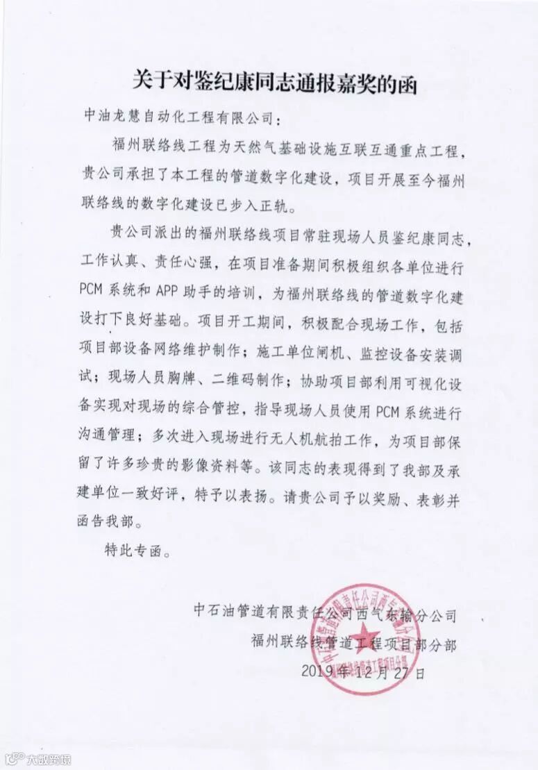 2019年12月27日,福州联络线天然气互通项目发来的嘉奖函。表彰了公司福州联络线项目数字化建设运维组在福州联络线管道数字化建设中的表现出的专业水平和奉献精神,保障了项目平稳有序的运行。同时特别表扬了项目组人员申志亮、马建忠、鉴纪康在项目过程中所表现出的吃苦耐劳精神和良好作风。