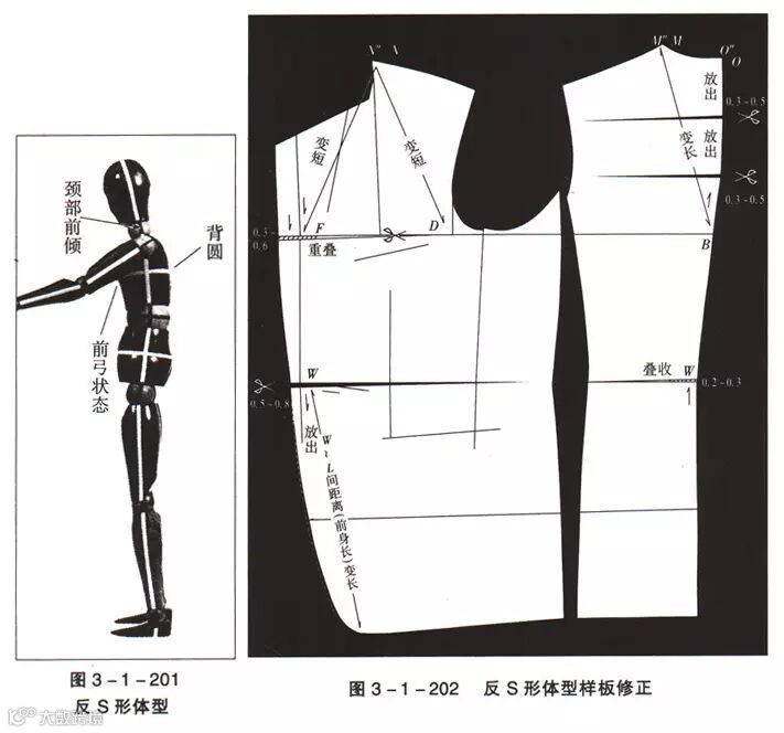 由人体模型侧面可知(图3-1-201),这种体型的上半身前弓弯曲,胸部狭窄腹部凸出。后背宽阔而呈圆状,臀部后凸,整体呈反“S”形。纵轴弯曲成反“S”形。因此,前身的上半身短而下半身长;后身的上半身长而下半身短。与标准体型比较,颈部前倾,侧颈点前移,手臂位置则后移。样板修正见图3-1-202。