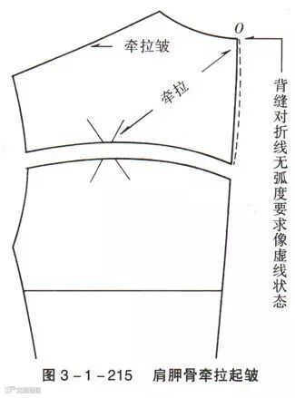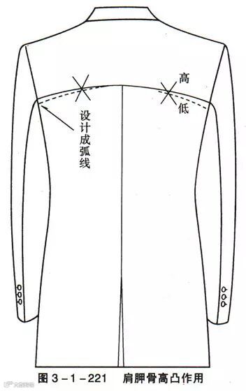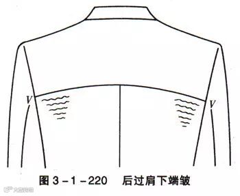 后背过肩缝合后,由于肩胛骨高凸(图3-1-220,图3-1-221),过肩起吊,使V的位置出现余皱,特别是装后腰带的款式有背裥,余皱更明显。