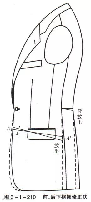 (2)、样板修正:如图3-1-210所示,在A(前身止口)将浮、翘的衣身保持稳定的状态,用别针锁住,这时侧身A′位置量不足,出现吊皱,为消除不足量,在图示部位开放量,由此衣身得以稳定。