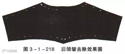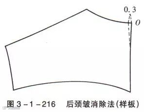 如图3-1-216所示,将后点0放宽0.3cm,缝合后作归烫处理,可以达到图3-1-217和图3-1-218的效果。吊皱消除了,领子也吻合了(图3-1-219)。