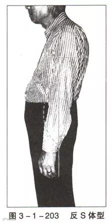 (1)、如图3-1-203所示,纵横轴交叉,纵向如虚线所示,反“S”形,上半身前面前弓弯曲,胸部狭窄;后背宽阔而溜圆。下半身腹部前凸,背脊线弯曲而臂部凸出。