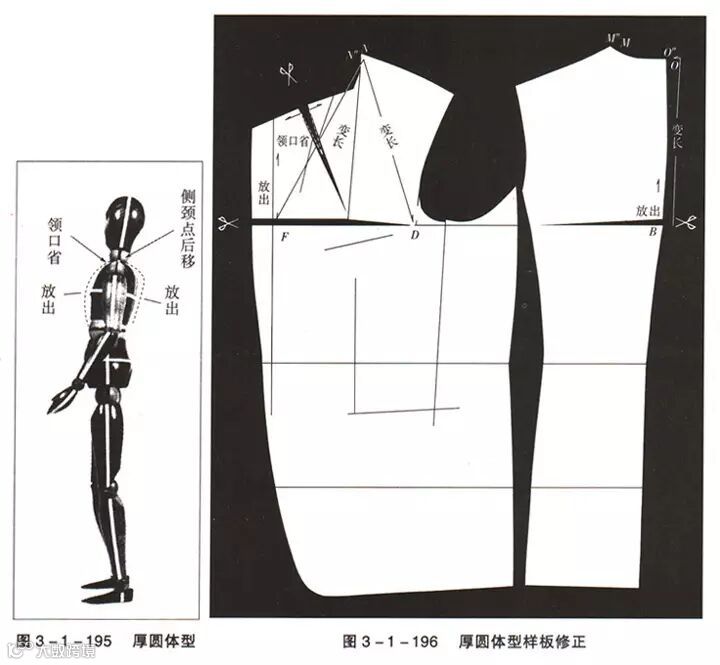 由图3-1-195人体模型侧面可以看出,这种体型如虚线所示,身体厚实,胸部、后背宽厚,略呈圆柱状(相对于扁体而言)。在青年人和运动员中较多见。与标准体型比较,胸部圆厚,后背也肉多厚实,整体丰满感强,纵轴直,手臂向外侧张开。样板修正如下(图3-1-96)。