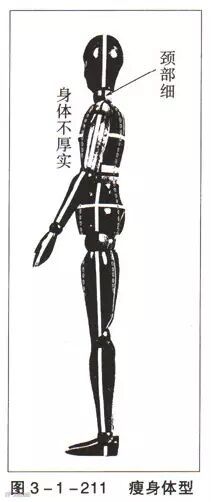 (1)、体型:量身定制西装,看人体模型正面可知(图3-1-207),腰骨凸出的体型身体细长而无厚度,俗称“水蛇腰”体型。特点为:细长腰身、腰骨前凸、0形腿。