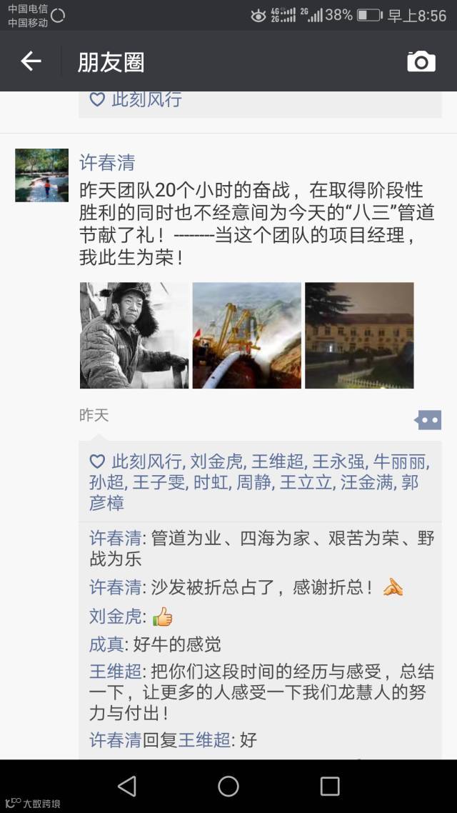 “昨天团队20个小时的奋战,在取得阶段性胜利的同时也不经意间为今天的“八三”管道节献了礼!--------当这个团队的项目经理,我此生为荣!”