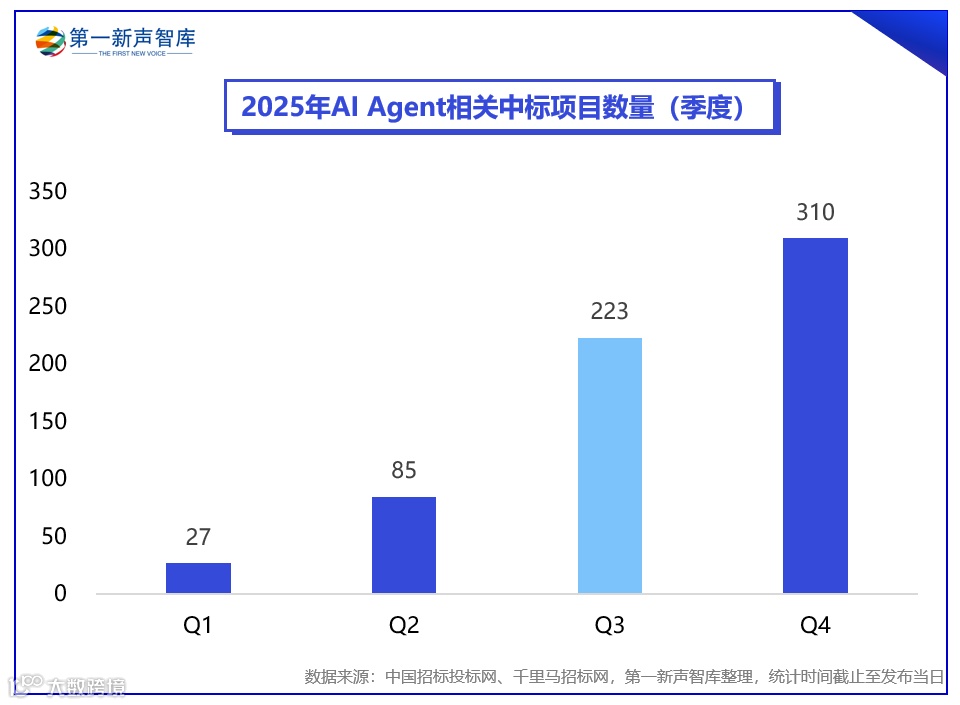 市场活跃度在2025年第三季度得到显著印证。据第一新声智库不完全统计,本季度AI Agent公开中标项目数量跃升至223个,较上季度激增162%,反映出从“概念教育”、“部分探索”到“多行业价值验证”的变化,个别Agent厂商营收已达到亿元级别。