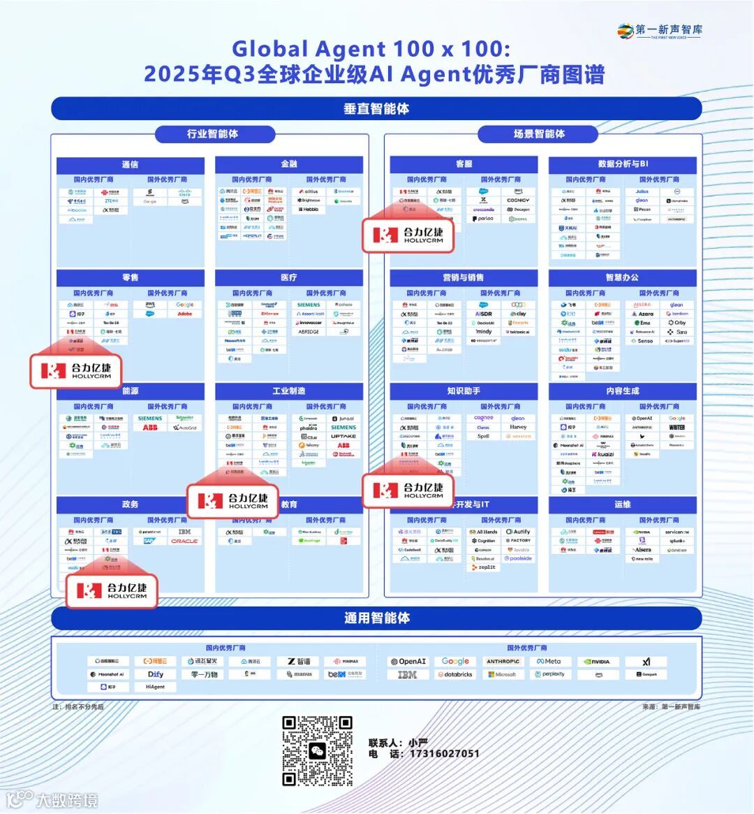 近日,第一新声智库正式发布《Global Agent 100 x 100:全球企业级AI Agent优秀厂商图谱》。合力亿捷成功入选,并在客服场景智能体、知识助手智能体,以及零售、工业制造、政务多个行业分类中获得推荐,展现出在企业级AI Agent领域的综合实力与行业深度。