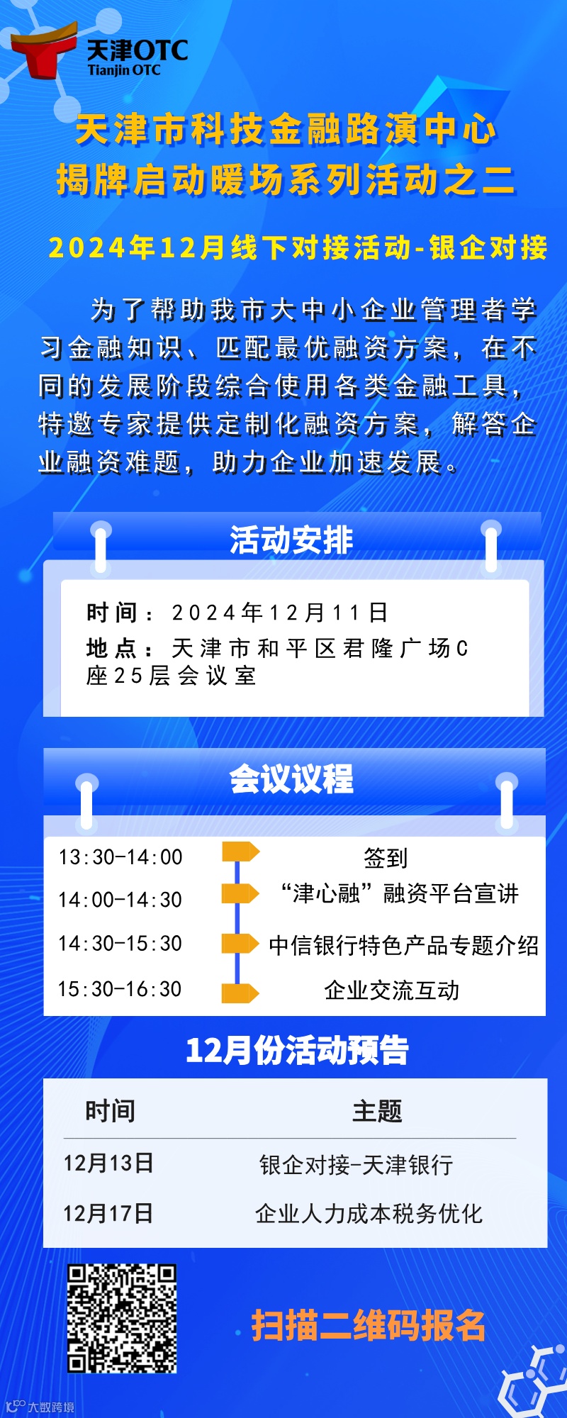 天津市科技金融路演中心揭牌启动暖场系列活动之二  2024年12月线下对接活动-银企对接 天津滨海柜台交易市场
