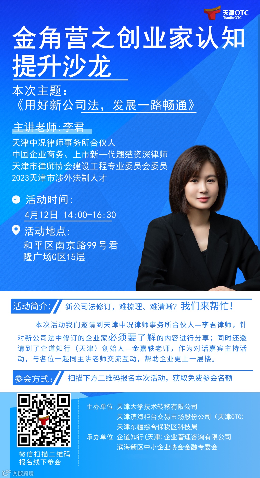金角营之创业家认知提升沙龙—用好新公司法,发展一路畅通|OTC邀请 天津滨海柜台交易市场