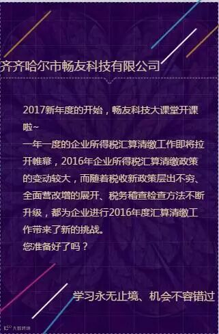 原定于畅友公司4月8日在齐齐哈尔齐大培训中心举办的“2016年企业所得税汇算清缴专场培训”因火热报名中会场容纳量已达到上线,为保证给大家最宽敞的学习环境,现培训地点变更为齐齐哈尔工程学院图书馆1层101室,培训的时间、内容不变。我们对此给大家带来的不变表示歉意。