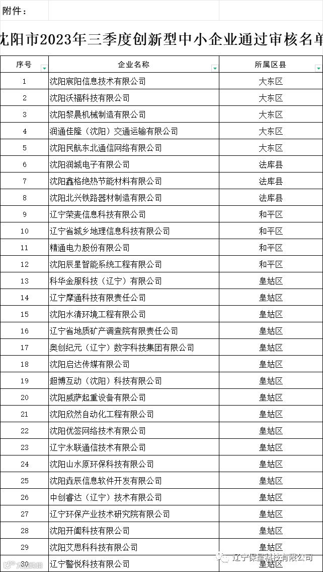 辽宁保呈科技有限公司保呈快讯内容:关于《沈阳市工业和信息化局关于2023年三季度创新型中小企业通过审核名单的公示》-内容分享