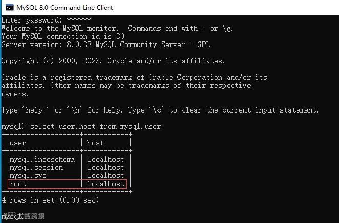 查看用户以及用户对应的host,在终端中输入以下命令即可查询。