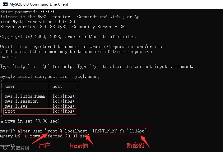 用户可按需修改命令中的用户名、host值和密码,完成自定义设置,以达到修改密码的目的。