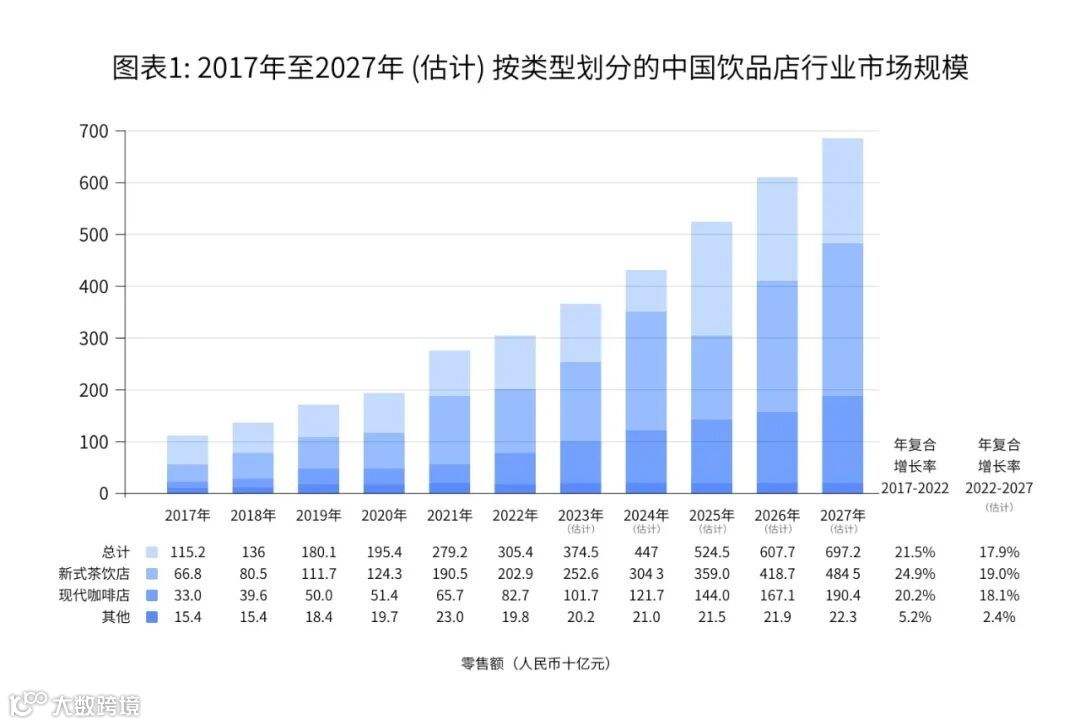 “根据弗若斯特沙利文相关数据,新式茶饮店行业的市场规模由2017年的668亿元增至2022年的2029亿元,预计到2027年新式茶饮店行业市场规模将增至4,845亿元。”