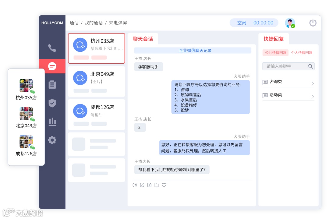 门店在遇到原材料售后、水果问题、设备维修等运营难题时,仅需在群内@企微客服助手,根据智能引导描述相关问题,客服根据企微客服助手的智能分配快速接待,精准定位、记录该门店运营问题,且整个运营环节,品牌都能根据系统后台数据实时掌控;