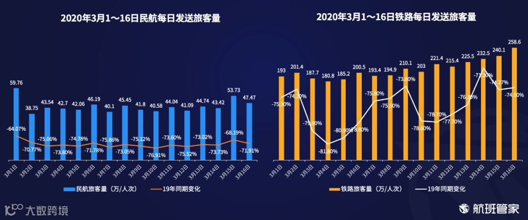 航班管家发布的相关报告数据显示,进入3月份以来,民航、铁路旅客量正在有序恢复,3月1日~16日,其中民航共发送旅客715.42万人次,环比二月份同期增长71.15%,日均发送旅客约44.71万人次;铁路共发送旅客3343.5万人次,环比二月份同期增长66.43%,日均发送旅客约208.97万人次。