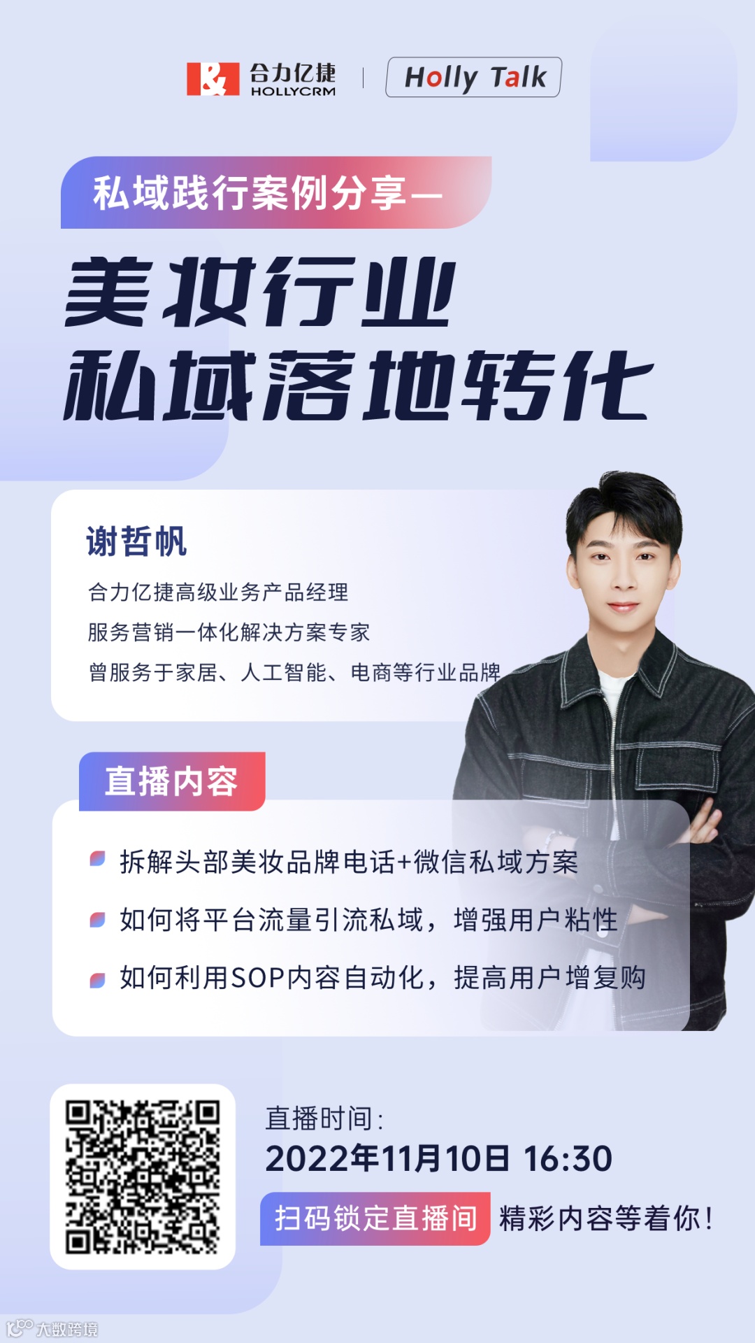 为此,2022年11月10日(周四)16:30“HollyTalk”线上直播分享会,将邀请合力亿捷高级业务产品经理谢哲帆先生,带来国内某美妆头部品牌的私域运营解决方案,如何攻克用户及业绩双增长难题,保持品牌核心竞争力。