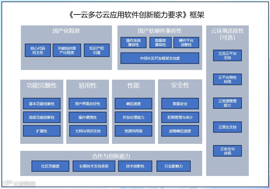 为此推出的“一云多芯云应用软件创新能力要求”评估体系,以科学量化方式设定了国产云软件的创新门槛: