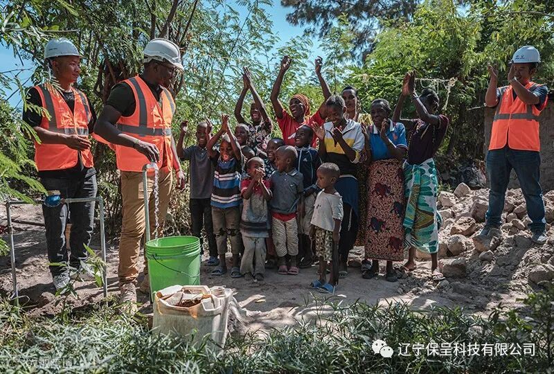 6月13日,在坦桑尼亚姆万扎省米松圭,凯尔文(左二)与同事接通水管后赢得当地居民鼓掌欢呼。新华社记者 王冠森 摄