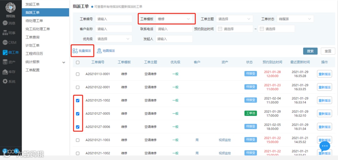 1、登陆微工单后,并找到微工单,并点击发起工单。并填写工单信息,包括:工单模板、工单主题、联系人、联系电话、预约到达时间等。信息填写完毕后,点击发起并指派按钮。