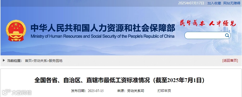 7月15日,人力资源和社会保障部公布了全国各省、自治区、直辖市最低工资标准情况(截至2025年7月1日)。