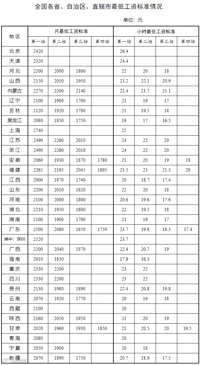 数据显示,月最低工资标准方面,上海最高,为2740元;北京为2420元,广东第一档为2500元,江苏、浙江相同,第一档为2490元。从小时最低工资标准来看,北京最高,为26.4元;上海为25元,广东、江苏、浙江第一档分别为23.7元、24元、24元。