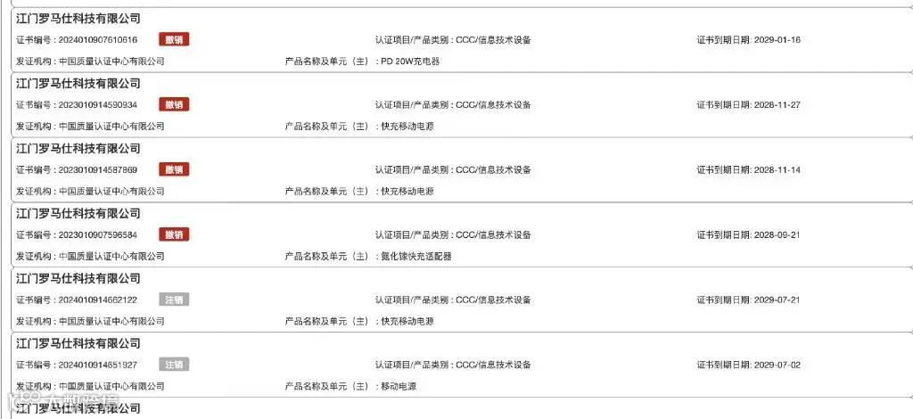 据此前报道,6月20日,国家市场监管总局全国认证认可信息公共服务平台显示,罗马仕科技相关公司的快充移动电源3C认证被大批暂停注销,剩余3C认证多与充电器、电源适配器相关。
