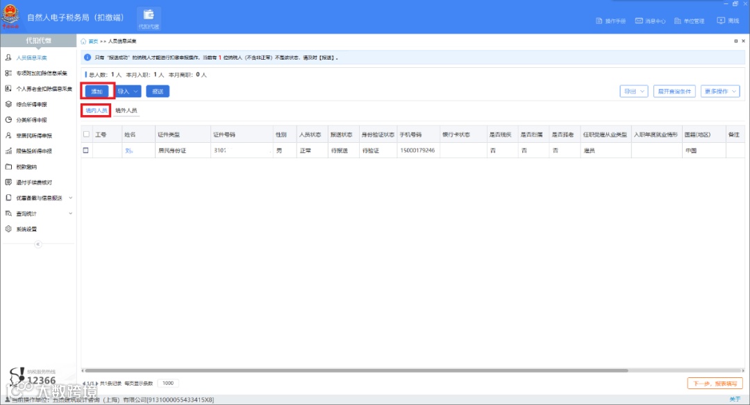 (1)选择【境内人员】,点击【添加】,进入境内人员信息填写页面。