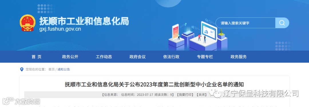 辽宁保呈科技有限公司本期保呈快讯内容:关于《抚顺市工业和信息化局关于公布2023年度第二批创新型中小企业名单的通知》-内容分享