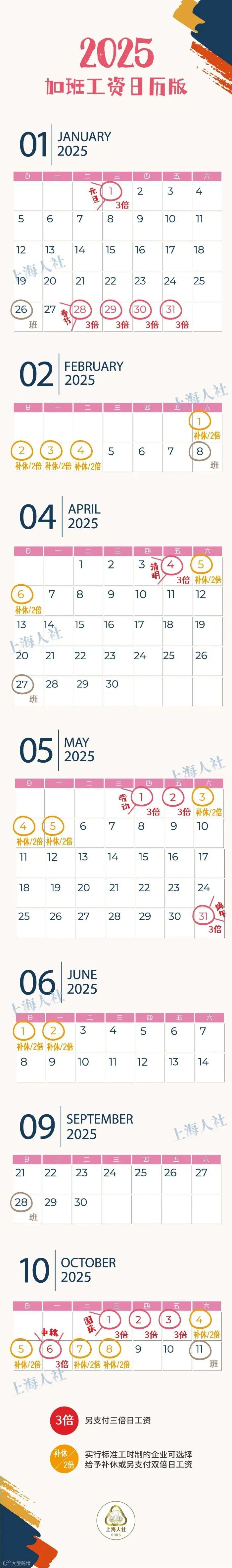 以下是上海人社制作的2025年加班工资日历,需要的可以收藏备查。👇