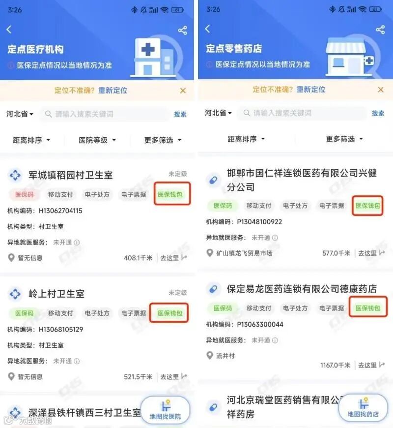 通过国家医保服务平台APP查询服务,“定点医疗机构”和“定点零售药店”,可查询当前已开通医保钱包支付的定点医药机构。
