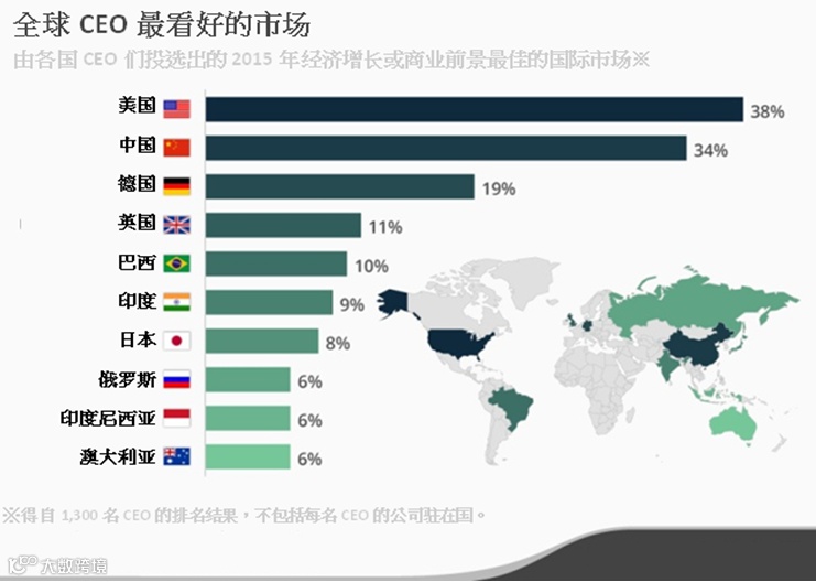 接受调查的CEO中,有38%看好美国的业务前景,较2014年的30%有所增加。石油行业的繁荣和消费支出的增长,都促进了美国经济情况的改善,正在为企业带来更加可观的经济收益,因此各国的公司领导人对美国市场的乐观态度也就在意料之中了。