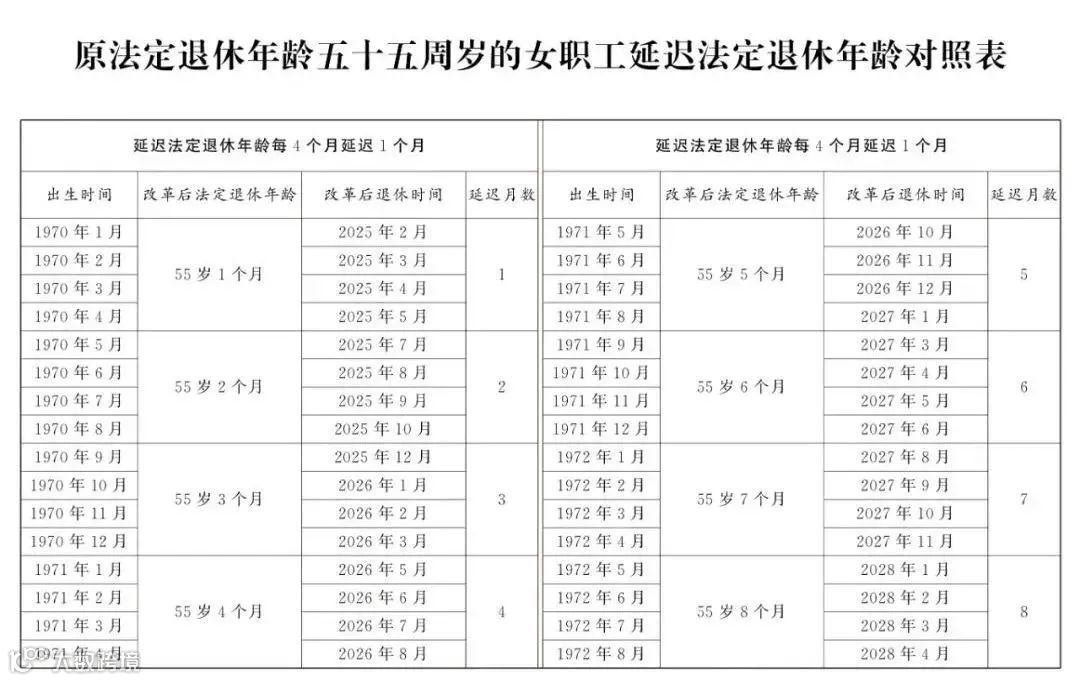 从2025年1月1日起,原法定退休年龄为五十五周岁的女职工法定退休年龄每四个月延迟一个月,逐步延迟五十八周岁。