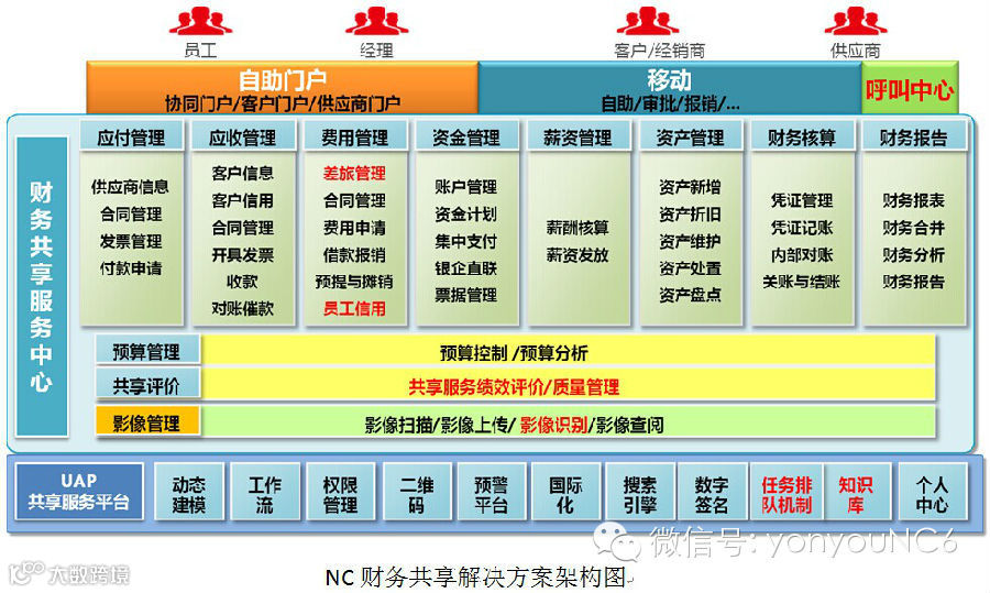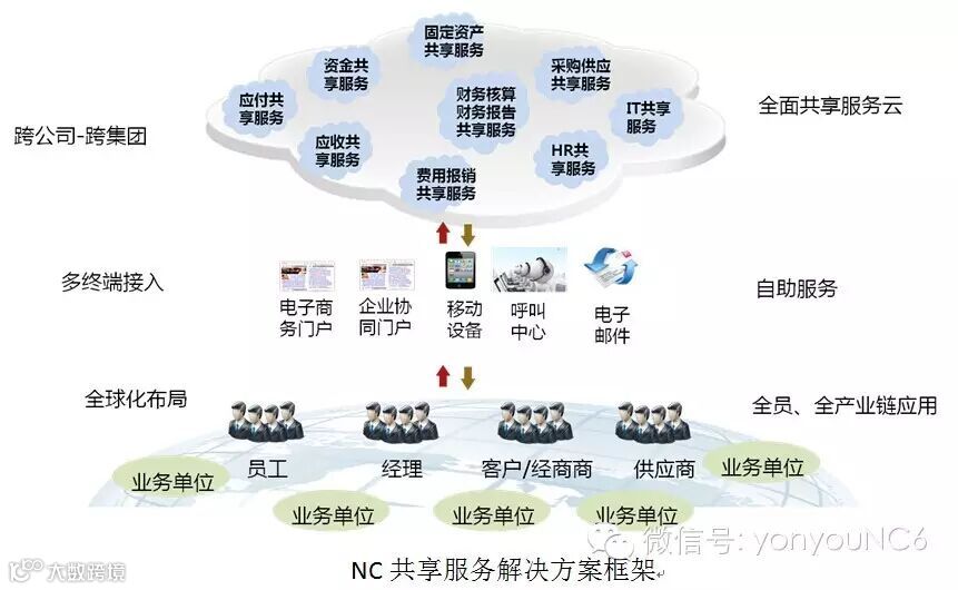 NC6财务共享服务解决方案提供全面完整的共享服务应用,助力集团企业的财务共享服务建设。NC6财务共享服务平台,帮助集团企业构筑财务云服务,并通过协同门户、移动设备、呼叫中心等多种终端,接入来自全球各业务单位的员工、经理,以及来自于产业链的客户、经商商、供应商的各类服务请求,提供覆盖全员全产业链的财务共享服务。