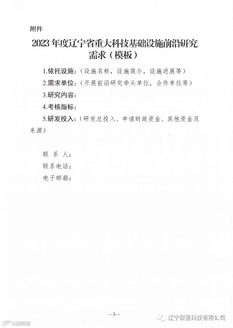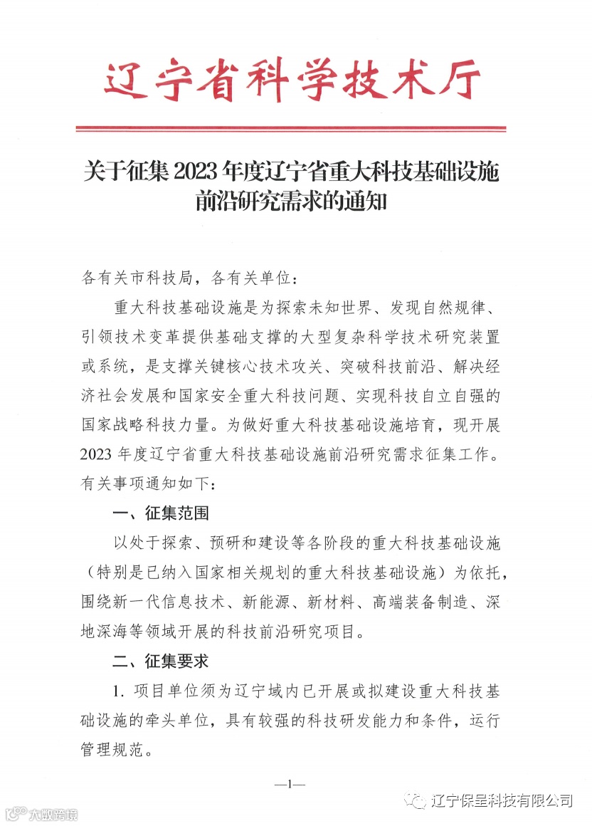辽宁保呈科技有限公司本期保呈-快讯内容:关于《沈阳市科技局关于转发省科技厅《关于征集2023年度辽宁省重大科技基础设施前沿研究需求的通知》的通知》-内容分享