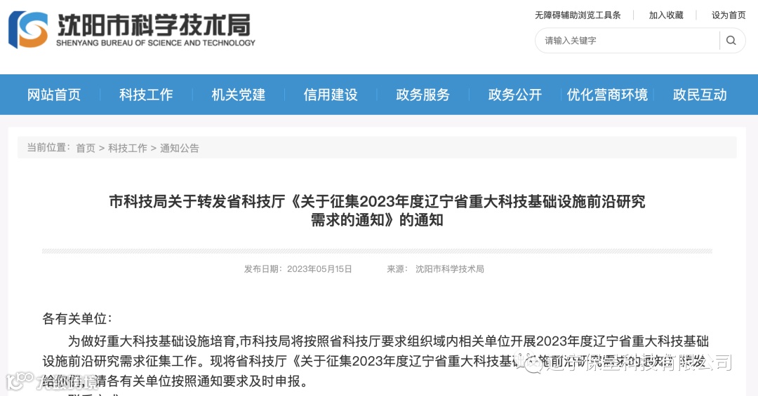 本期保呈-快讯内容:关于《沈阳市科技局关于转发省科技厅《关于征集2023年度辽宁省重大科技基础设施前沿研究需求的通知》的通知》-内容分享