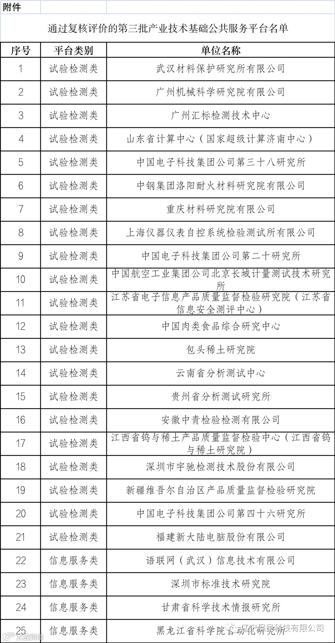 第三批产业技术基础公共服务平台复核评价结果的通知