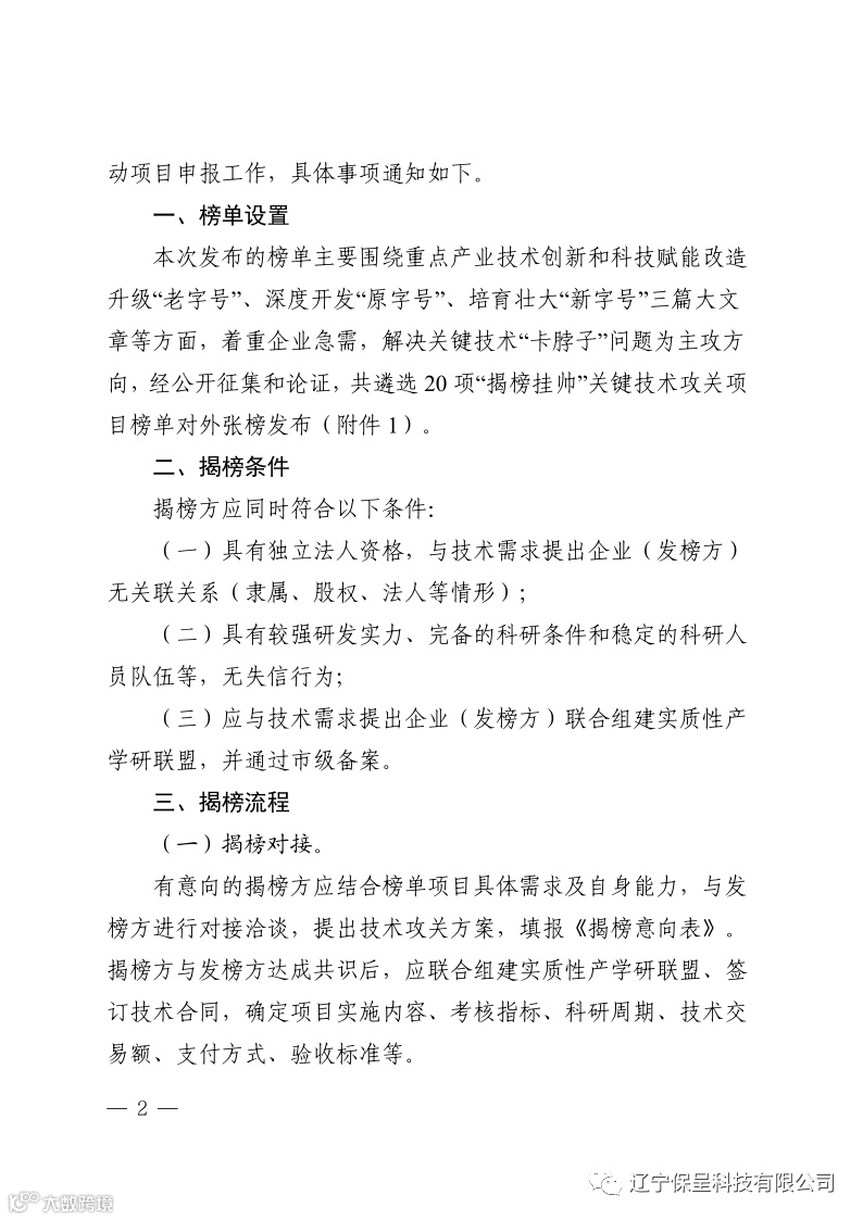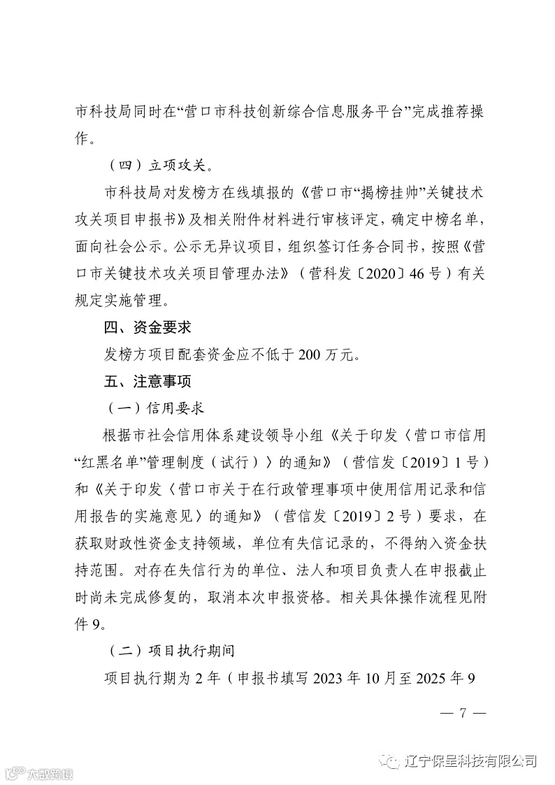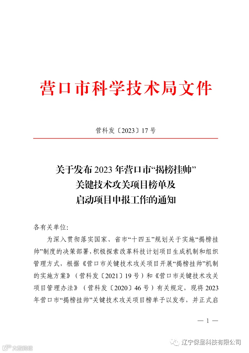 保呈快讯内容:关于《营口市关于发布2023年营口市“揭榜挂帅”关键技术攻关项目榜单及启动项目申报工作的通知》-内容分享