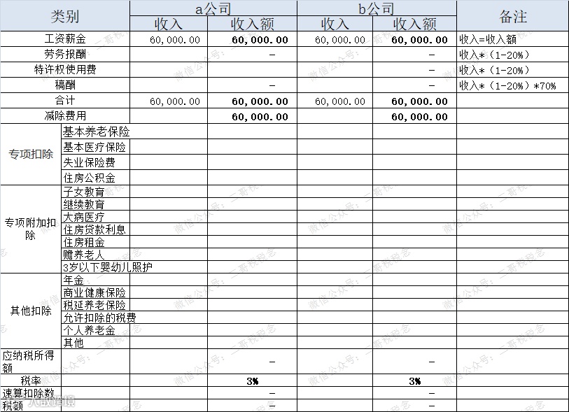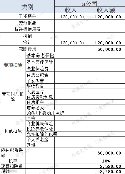 小编有两个公司a、b公司,a公司发工资12万,b公司不发工资,假设没有社保公积金,也没有专项附加扣除。