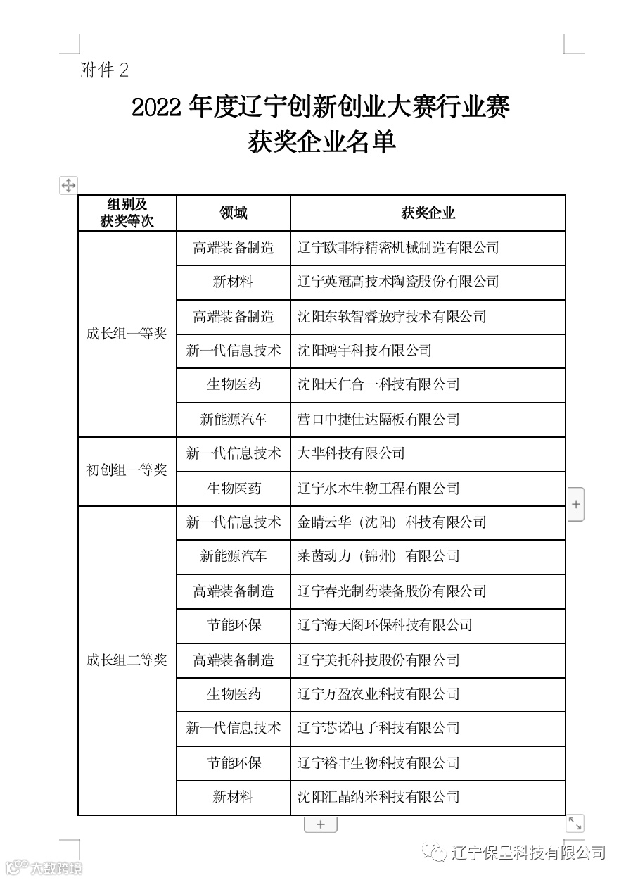 辽宁保呈科技有限公司本期保呈-快讯内容:关于《关于2021年2022年辽宁创新创业大赛行业赛获奖企业奖励性后补助名单公示》-内容分享