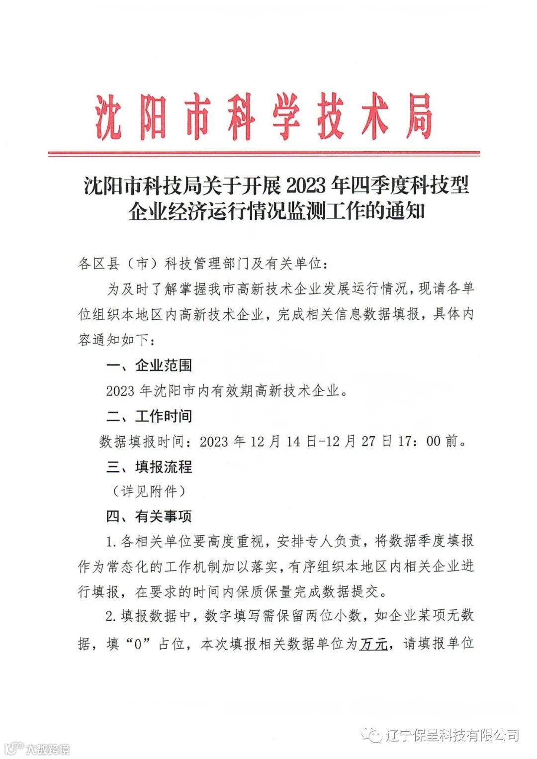 保呈快讯内容:关于《沈阳市科技局关于开展2023年四季度科技型企业经济运行情况监测工作的通知》-内容分享