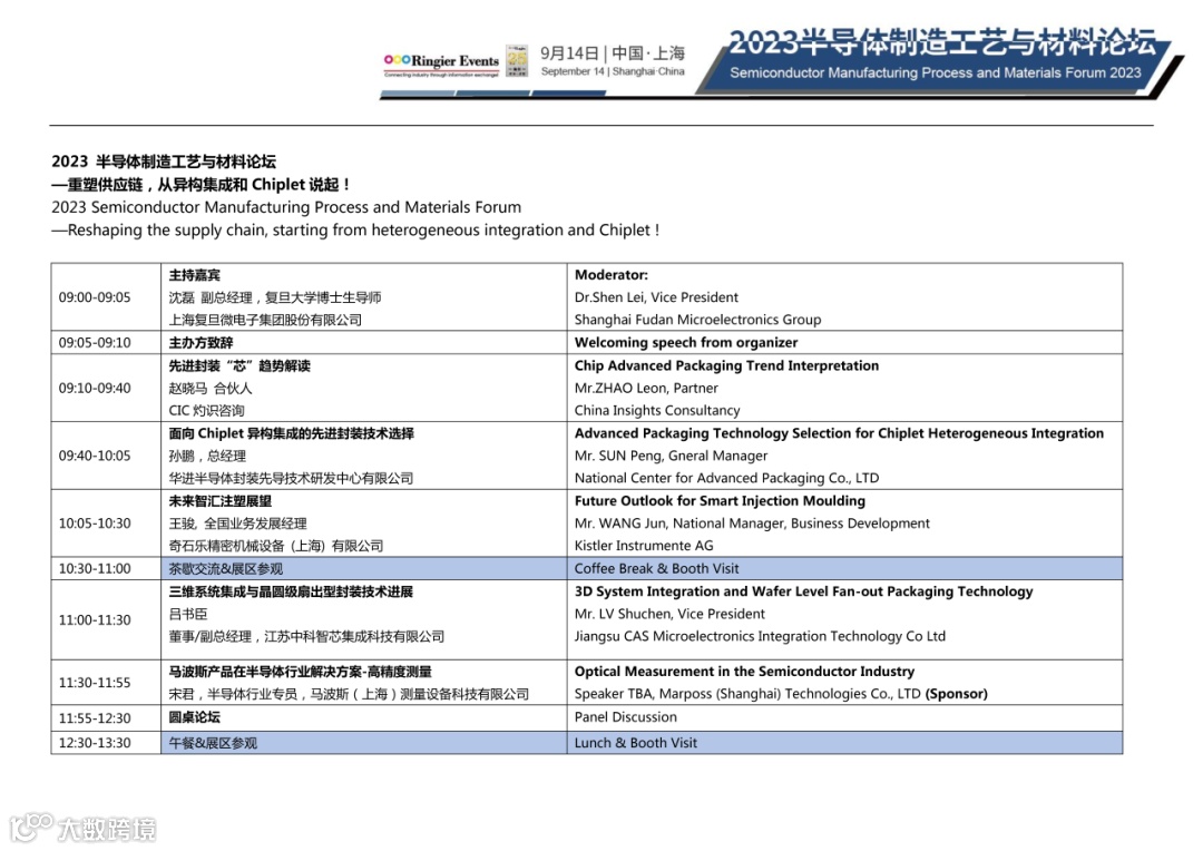 在此背景下,荣格工业传媒将于9月14日在上海召开2023半导体制造工艺与材料论坛。从异构集成和Chiplet谈起,邀请Fabless,晶圆厂,OSAT,设备材料商齐聚一堂,围绕关键工艺、设备材料、封装测试领域的市场现状、前沿技术、发展瓶颈、国产替代进程等重要话题展开讨论。