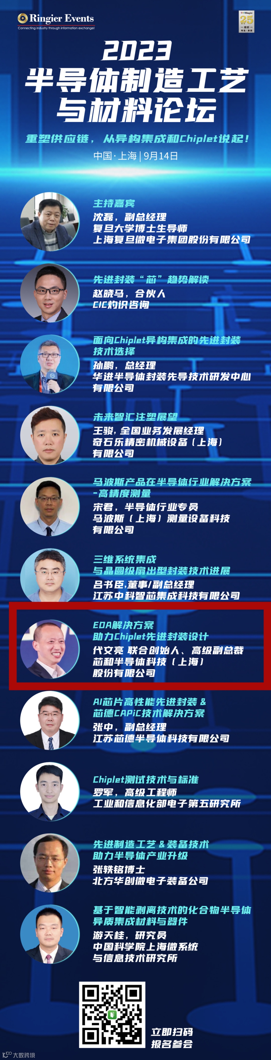 9月14日,芯和半导体将参加在上海召开的“2023半导体制造工艺与材料论坛”。届时,芯和半导体的联合创始人、高级副总裁代文亮博士将作报告《EDA解决方案助力Chiplet先进封装设计》。
