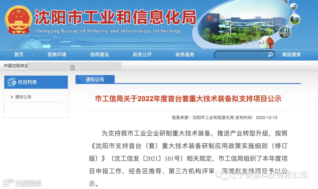 本期保呈快讯内容:关于《沈阳市工信局关于2022年度首台套重大技术装备拟支持项目公示》-内容分享