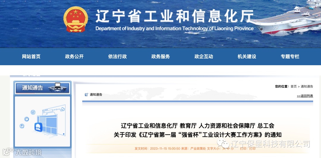 保呈快讯内容:关于《辽宁省工业和信息化厅 教育厅 人力资源和社会保障厅 总工会关于印发《辽宁省第一届 “强省杯”工业设计大赛工作方案》的通知》-内容分享