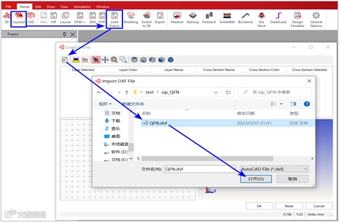 运行Hermes后,在左上角菜单栏中选择Home的layered流程,再选择Lead Frame流程。在弹出窗口中,选择导入所需的DXF文件。