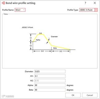 Wire bond:键合线层,用户可在profile中定义键合线的JEDC4/5标准的相关几何信息、线材,线宽等。Start和End分别为键合线打线时的起始和终止位置。此案例中,由于DXF中的wire bond图层共有7个,所以需要设置7种wire bond组合,起始位置分别是Die1->Lead Pad、Die2->Lead Pad、Die1->E Pad、Die2->E Pad、Die3-> E Pad、Die2-> Die1、Die3-> Die2。